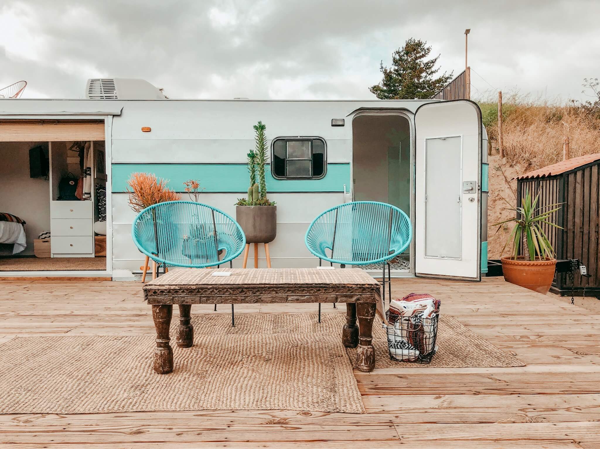 As soon as you enter the property— your eyes are drawn to the expansive views of the valley’s hillsides, and the sounds of birds chirping in the distance fill the surroundings. Each trailer has it’s own deck area with outdoor seating— equipped with blankets for the cooler nights. Just through the glass sliding door of the Airstream, you step into your own little luxurious camping haven. The cozy bed will make it awfully hard not to drop your luggage right then and there, and jump in. The modern kitchenette is equipped with a mini fridge, a coffee machine, and all the basics to enjoy a meal with heavenly views. The bathroom is perfect, with stunning black and white tiles, and a continuation of gold fixtures, including the rain shower. The attention to detail is amazing, with the pops of color, and artwork filling the trailer. No matter the season, each trailer is also equipped with both air conditioning, a heater, and plenty of blankets.